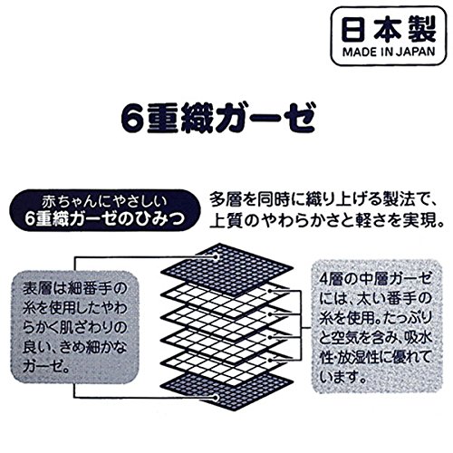 6層構造に重ね織りしたベビーバスローブです☆ やわらかく、ふっくらとした肌触りでやさしい風合いが特長のガーゼを使用したベビーバスローブです。 通気性・吸水性・速乾性に優れているので、汗っかきの赤ちゃんにとても便利です◎ 通気性が良く、軽くて柔らかいガーゼ素材は、吸湿性も良く、生地表面が平面のため引っ掛かりもなく、赤ちゃんやお子様のデリケートな肌に安心して使えます。 毛羽落ちがほとんど無いのもオススメです。 【6重織りガーゼのひみつ】 ●1層・6層……身体に触れる表面は、細い糸をきめ細かく織り上げて繊細な肌触りのガーゼ。やわらかく、いつもサラサラとした爽やかな感触。 ●2層・3層・4層・5層……4層の中間層のガーゼには、やや太い番手の糸を粗く網状に織り、たっぷりと空気を含み、吸水性・放湿性に優れたボリューム層。 多層を同時に織り上げる製法で、厚みを持たせながらも、上質のやわらかさと軽さを実現! 新生児から3才頃まで幅広くお使いいただけます。 赤ちゃんをお風呂上りにすっぽりと包んであげたり、水遊びで体が冷えないようサッと羽織ったりなど便利に使えるアイテムです。 UVカット効果も備わって、お子様の肌を紫外線から守ります。 ●紫外線遮蔽率(UVカット)90%以上 ●対象年齢:新生児~3才頃まで ●寸法 (cm)身幅:38 着丈:46袖丈:35 ※表示寸法は目安となっております。実際の商品の寸法とは若干差がある場合がございます。ご了承くださいませ。 [品質]綿100% [生産国]日本