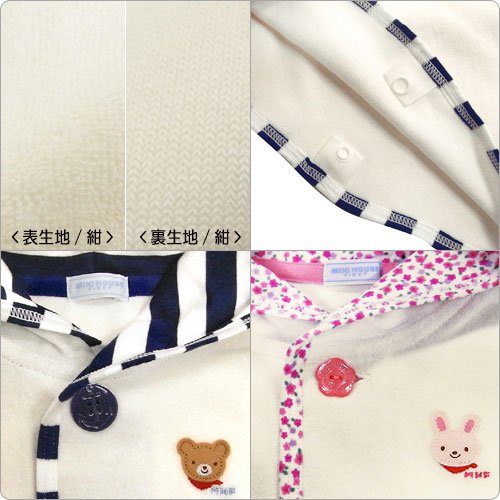 くまちゃんとうさちゃんのアップリケ刺繍がついた薄手のポンチョです☆ 細やかな目のパイル素材のポンチョです。 春先からの肌寒い時期や秋口くらいまで活用できる便利な羽織物ポンチョ! UVカット機能付きで、春先からの紫外線や日差しからも赤ちゃんを守ります。 また、室内での冷房対策など、体温調節にも重宝します! フードが付いているので、頭までしっかり守ってくれますよ◎ やわらかで細やかな薄手のパイル素材で、肌触りも抜群!! 優しい感触で赤ちゃんのお肌にも安心◎◎ 前ボタンで着脱できます。 くまちゃんにはイカリマークのボタン、うさちゃんにはラメ仕立てのお花型のボタンをつけました。 裾のホックを留めると袖を通すことができて便利です。 新生児から、2、3歳くらいまでオールマイティーに使えるオススメのアイテムです♪ ●紫外線遮蔽率(UVカット)90%以上 【品質】綿75%、ポリエステル25%(フード裏・パイピング)綿100% 【生産国】日本