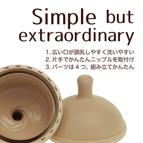 - ニップルはママのおっぱいに近い色と肌触り。体に安全なドイツ製シリコーンとポリエステルを使用。ニップルには空気の飲み過ぎによる腹痛(colic)を防ぐため、中に独自の通気孔があります。※ボトルにはニップル1(ゆっくり)が付属