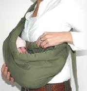 ![]() | 3.生地を広げながら、両脚を上げた状態でお尻から順に、座らせるようにしてスリングの中に |