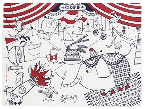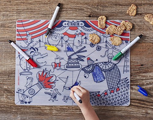 Size:With 4 Markers ?|? Style Name:Circus Offering a fashionable, functional, and safe design that will delight parents, the modern-twist Mark-Mat placemat is ideal for providing kids with a clean eating surface while nurturing their inner artist. This reusable placemat features a whimsical motif designed by an independent artist that your child can color with the four included nontoxic, dry-erase markers (red, yellow, green, and blue). After each use, the Mark-Mat can be made like new with a wipe from a damp cloth or a rinse -- it can be colored again and again. It's also dishwasher-safe and won't crease or rip. Ideal for use on tabletops at home, at restaurants, or on the go, the flexible Mark-Mat rolls up for easy portability without damaging it. Like all modern-twist products, the Mark-Mat is made from 100-percent pure, FDA-approved food-grade silicone, an anti-microbial, nonporous material produced from natural elements that is free of BPA, PVC, lead, latex, phthalates, and other harsh chemicals. The Mark-Mat is heat resistant up to 425 degrees F, enabling you to place warm dishes on it to protect your table's surface (though it should not be used as a trivet). It also prevents crumbs and liquid from seeping through. This silicone placemat measures 16 inches by 12 inches (LxW). modern-twist has pioneered the use of pure food-grade, hand-silk screened silicone for placemats, table runners, coasters, baby products, and more with aesthetically inspiring designs that will enliven your home.