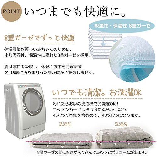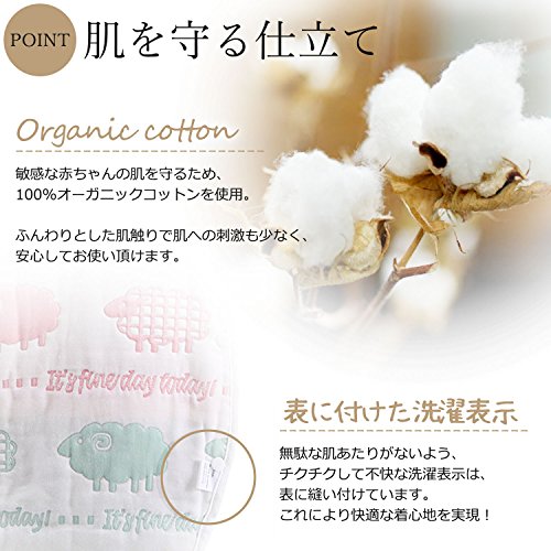 - 【こだわりの素材と縫製】赤ちゃんの肌を守るため、素材は綿100%(オーガニックコットン)、洗濯表示タグも表につけることで無駄な肌あたりがないように仕上げました。また、8重にこだわることで、より高い吸湿性、保温性と柔らかさを追求しました。夏は素肌をサラサラに保ち、冬は暖かさを逃しません。