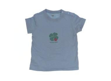 四葉のクローバーにテントウムシのデザイン。左肩にスナップボタンが付いています。目立った汚れはなくまだまだお使いいただけそうです。
