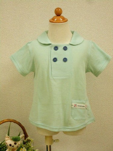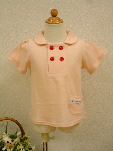 <品質> 綿100% とってもやわらかな肌触りのA ラインT シャツです。水玉の4つのくるみボタンと、小さな丸いお襟がキュート