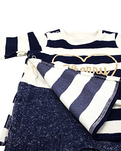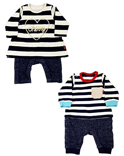 白黒のボーダーで男の子も女の子も似た雰囲気のオールです。どちらもセパレート風ですが、くっついている、コーディネートオールです。女の子の方は白黒の太めのボーダーにキラキラゴールドのハートとロゴの箔プリント入り!身頃はTシャツ素材、天竺が二重になっています。パンツ部分はデニム裏毛です。男の子の方は白黒ボーダー部分はふわふわ素材のパイル起毛素材。胸のポケットもボアでポイントになっています。パンツ部分はデニム裏毛です。