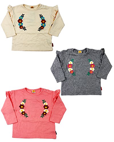 薄いガーゼのような素材を二重にしている接結素材♪とっても柔らか素材で着心地も良さそうです!(生地の特性上、洗濯によりしわがよる場合がございます。)肩のフリルにお花の部分は刺繍になっていて女の子らしいTシャツです。