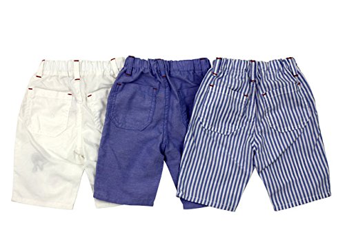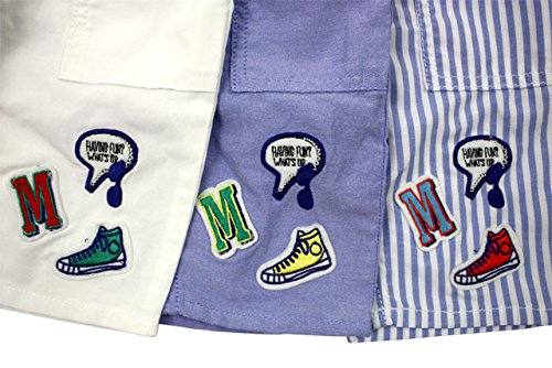 ホワイトとブルーがシャンブレー、ストライプがオックス素材のパンツです。どちらも薄手の布帛素材で夏でも涼しげに着れます!Mと吹き出しとスニーカーのワッペンがポイントの膝が隠れる位の6分丈パンツです。