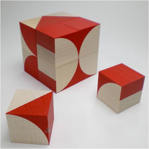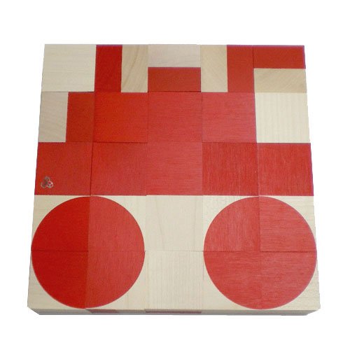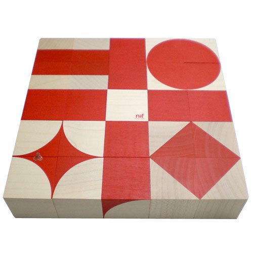 立方体6個の組み合わせで、好きなパターンを作ります。子どもたちは、手を動かしながら形の特性をつかんでいきます。キューブとパターンがきっちりとあう精度の良さはさすがです。パターン表付カエデ材 35mm角の立方体25個使用ネフ社
