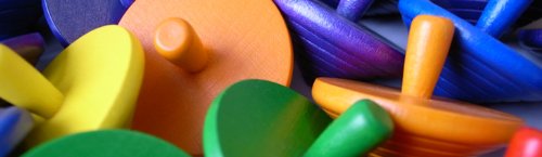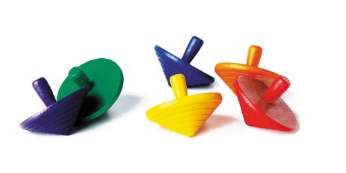 Wooden spinning tops in yellow, orange red, violet, blue and green. Product information: Diameter 4 cm Design: Kurt Naef