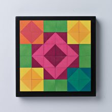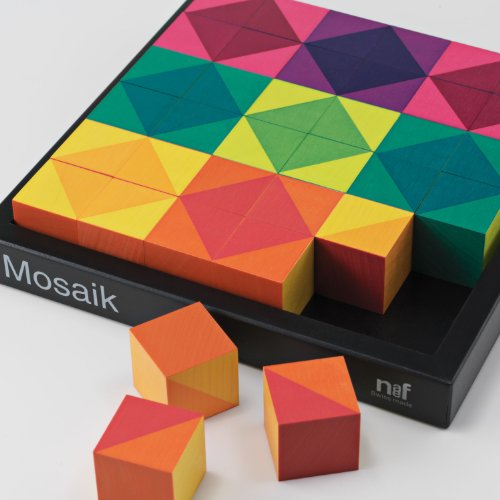 「めくるめく色の競演を楽しむカラフルなモザイクパズル」 ネフのモザイクパズルの中でも、ひときわカラフルな色調を揃えたキーナー・モザイク。その華やかな美しさは子どものみならず、大人まで夢中にさせる魅力を十分に秘めています。1ピースは2.5cm角の立方体。1ピース6面は、4色の同系色を組み合わせてそれぞれ異なったパターンで塗装されています。同じ 2.5cm角のネフスピール、アングーラとも一緒に組み合わせて遊ぐことも可能。デザイナーはカトリン・キーナー。小さい工房ながら、モビールやメモリーカードなど上質な木製玩具を手がけるスイスの玩具メーカー、キーナー社のデザイナー兼社長夫人です。カラフルな色彩感覚はキーナー夫人の得意技。ネフの世界トップレベルの塗装技術とのコラボレーションで、虹色のモザイクパズルが誕生しました。