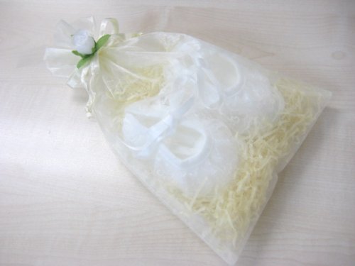 赤ちゃんの晴れの舞台に履かせてあげたい「天使のファーストシューズ」。ギフト包装でのお届けとなります。御出産祝いにもおすすめ!光沢のあるサテン地のリボンがとても上品な雰囲気です。