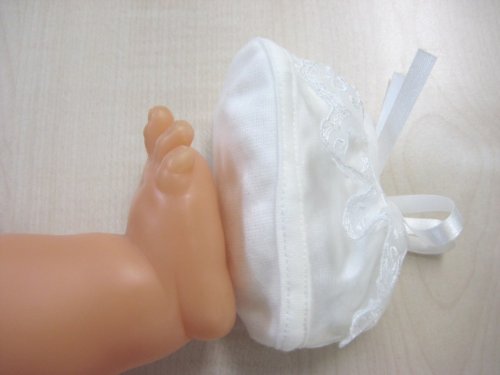 - 人形の赤ちゃんの足のサイズは実寸で7センチです。実際に着用される場合は、足の大きさに合わせて靴下・タイツを履かせてあげることをおすすめします。