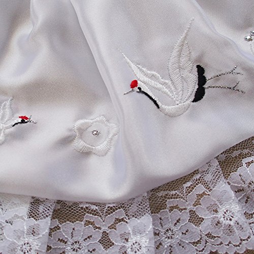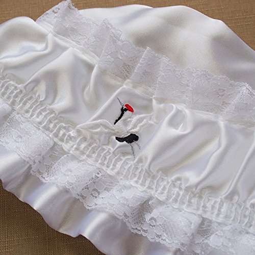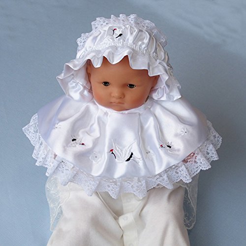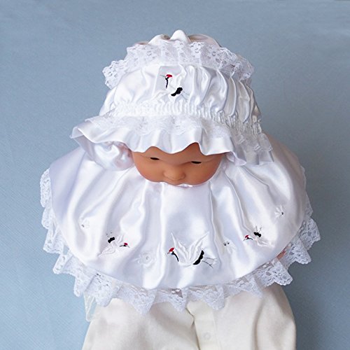 お宮参り用 お帽子・よだれかけ の2点セット。 上品で高級感のある鶴の刺繍入り。サイズは、あご紐結びタイプのお帽子となっておりますので、40から48センチを目安にフリーサイズとお考え下さい。 生地縫製ともに、安心安全の日本製。