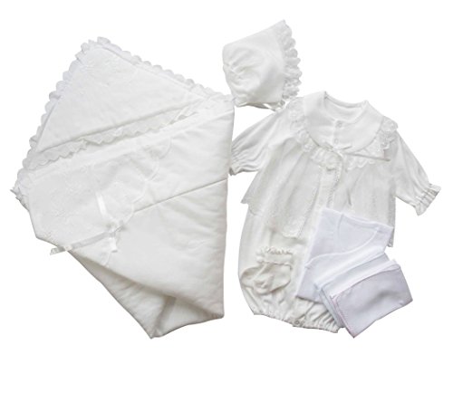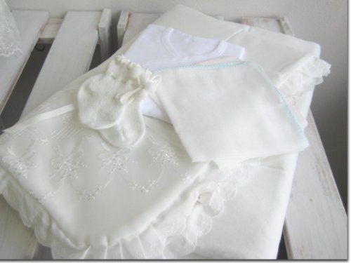 安心安全の日本製 新生児赤ちゃんの退院時やお宮参りにおすすめのベビードレス お帽子とドレス アフガンとソックスとガーゼハンカチとガーゼ短肌着が付いた6点セット 年中OKなスムース素材!ソックスは実寸8センチ 紐結び式なので脱げにくいですよ♪