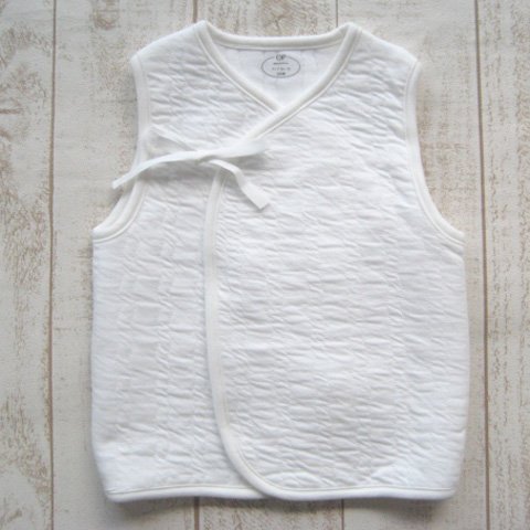 打ち合わせ式で内側・外側を紐で結ぶタイプのベストです。生後9ヶ月くらいまでは十分着用出来るサイズです。寒い季節のお出かけにはおすすめ!高品質な日本製!