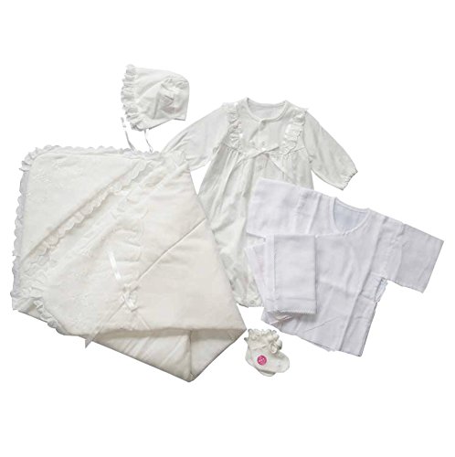 ベビードレスは華やか過ぎないシンプルで上品なデザインが人気のセットです!胸元にもフリルが付いていて、光沢のあるサテンリボンもポイント!うしろ側は抱っこしやすいシンプルなデザイン!アフガン・おくるみはとても上品でシンプルなデザインなので、お宮参り・お披露目などのお出かけにはピッタリですよ!アフガンは赤ちゃんをくるんで抱っこしてあげる時、フード型があるタイプです。ソックスは十分な伸縮性があるソックスです。ヒモ結び式なので、ズレない脱げないソックスです!短肌着は、打ち合わせ式なので、新生児から6ヶ月を着用期間の目安としてお考えください。
