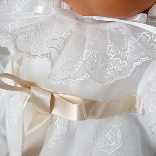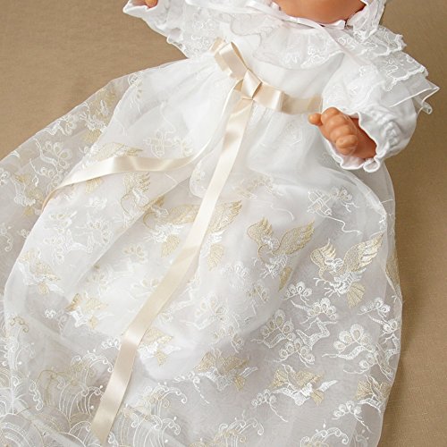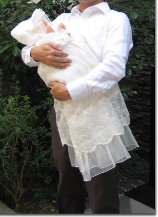 オーガンジーコートの丈は70センチで、2段になっているので、ふんわりと優しい雰囲気で記念写真などでは、とても映えるデザインになっています。襟元の大きなフリルも、可愛い赤ちゃんの生まれて初めての晴れ舞台で華やかな雰囲気を演出してくれます!オーガンジーコートは長袖ではございません!肩部分から長めのフリルが付いている、元気な赤ちゃんの腕の動きを妨げないデザイン!お帽子と胸元にも金色のサテンリボンが付いていて、とても華やかなデザインです!胸元のリボンの位置が高く、全体のバランスが良い、上品な雰囲気のドレスです!ふんわり広がるスカート部分の豪華な金糸 鳳凰刺繍柄!その他、お宮参りなどのお祝いで縁起が良いとされているものが柄として織り込まれております!ロングコートは、背中部分に2箇所、ボタンがございます!お宮参り・セレモニーなど大切な赤ちゃんの晴れ舞台に・・・・