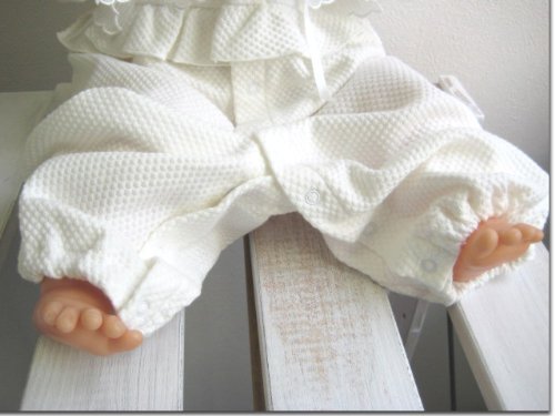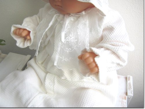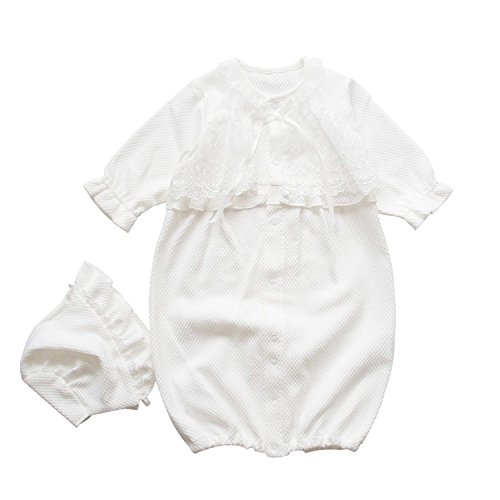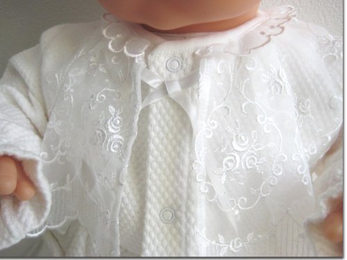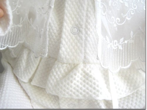 襟元から縫着された、短めの刺繍入りオーガンジーがポイントですよ!生地全体に凸凹があり、優しい風合いの素材です。うしろ身頃は、抱っこしやすいシンプルなデザインです。股部分のスナップボタンを付け替えるとカバーオールにもなる、便利なツーウェイタイプのドレスです。優しい風合いの素材で、シンプルですが上品な雰囲気!新生児赤ちゃんの退院時、お宮参りにおすすめ!