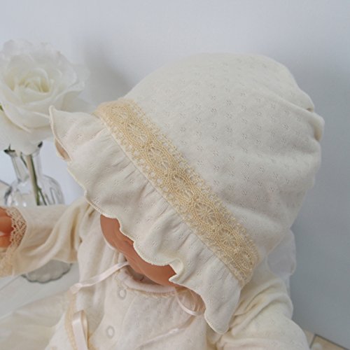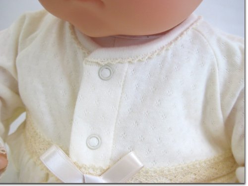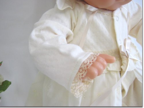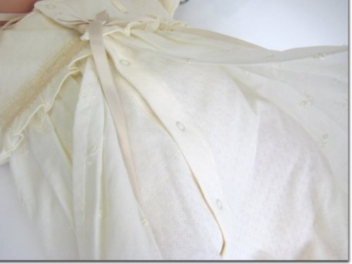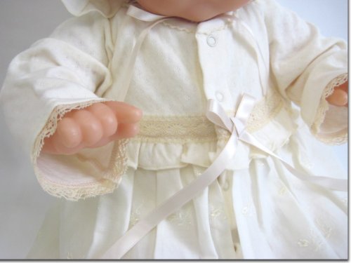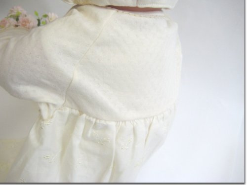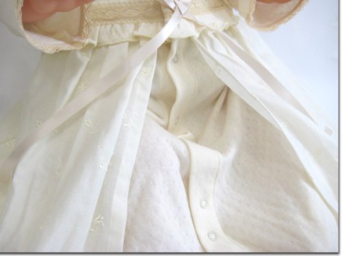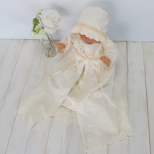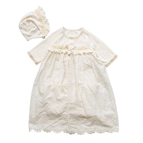 うしろ襟からスカート部分の裾までは、58センチ。うしろ襟からツーウェイ部分の足元までは、48センチ。お帽子は、アゴ紐結び式なので、サイズフリーです。お帽子の裏地は、柔らかい肌触りで吸湿性にも優れたガーゼを使用!全体的に華美すぎず、上品で素敵なデザイン。首まわりは、すっきりとした丸襟♪上品で清潔な雰囲気なので、カジュアルというよりもセレモニードレスというイメージが強いデザインです。お袖部分のチュールレースがとっても可愛いデザインです。うしろ身頃は、抱っこしやすいシンプルなデザイン♪新生児赤ちゃんが着用した状態で抱っこすると、スカート部分の裾が、やや垂れ下がる感じになります。ドレス部分は、肌触りがとっても柔らかい素材です。ベビー服・ベビードレス専門の縫製工場で生産され、生地、製品での厳しい検査をクリアした高品質なベビードレスです。ドレス部分は、股下部分のスナップボタンの付け方を変えるとカバーオールにもなる、便利なツーウェイタイプです♪