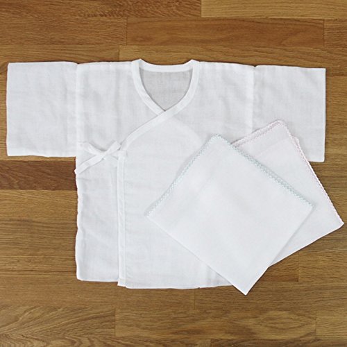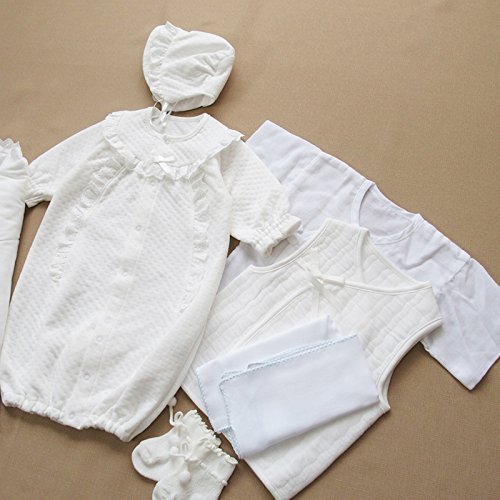 中わた入りのあったか冬物素材の新生児用ベビードレス・お帽子付の7点セット♪生地縫製ともに安心安全の日本製 肌寒い季節の退院時、お宮参りやお披露目の時に!肌触りの良いスムース地のアフガン、あったか素材インナーベスト・ガーゼ短肌着・ガーゼハンカチ・新生児用ベビーソックス の7点セット。