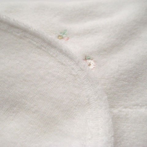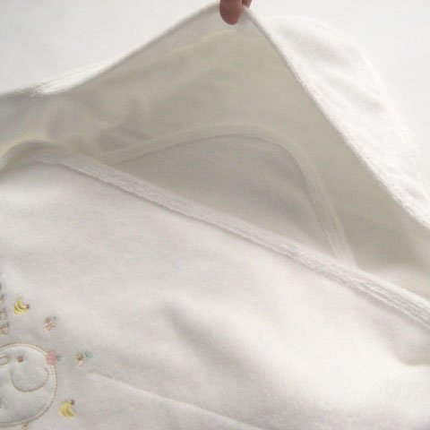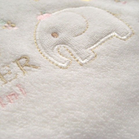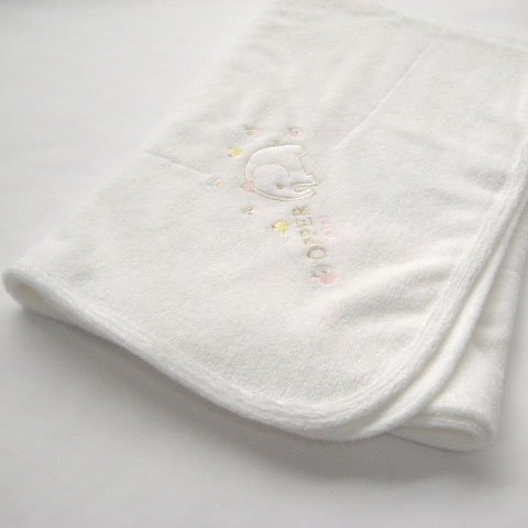 【甘撚り(あまより)パイルとは】 綿(わた)を糸にする段階で撚りを甘くすることで優しい感触にこだわった、肌触りがとても柔らかい素材です。表地:綿75% ポリエステル25% 肌に触れる部分の裏地は綿100%。 柔らかな肌触りを重視した甘撚りパイル地なので、生地の強度を補強するため、表地にポリエステルが含まれています。生地 縫製ともに高品質な日本製。サイズは85センチ×85センチ。中わたが入っていない柔らか素材のベビーアフガンおくるみです。気軽に使えて、お出かけ用としてもおすすめ!シンプルで可愛いゾウさんのワンポイント刺繍入り♪
