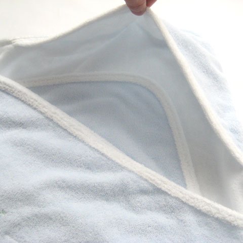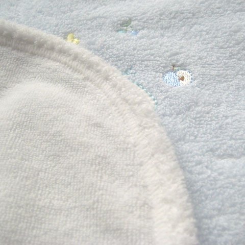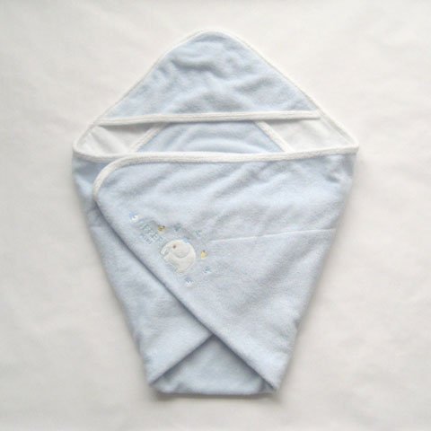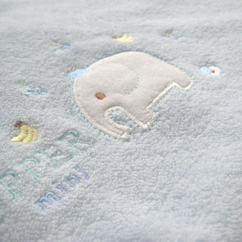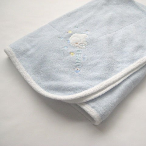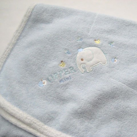 【甘撚り(あまより)パイルとは】 綿(わた)を糸にする段階で撚りを甘くすることで優しい感触にこだわった、肌触りがとても柔らかい素材です。表地:綿75% ポリエステル25% 肌に触れる部分の裏地は綿100%。 柔らかな肌触りを重視した甘撚りパイル地なので、生地の強度を補強するため、表地にポリエステルが含まれています。生地 縫製ともに高品質な日本製。サイズは85センチ×85センチ。中わたが入っていない柔らか素材のベビーアフガンおくるみです。気軽に使えて、お出かけ用としてもおすすめ!シンプルで可愛いゾウさんのワンポイント刺繍入り♪