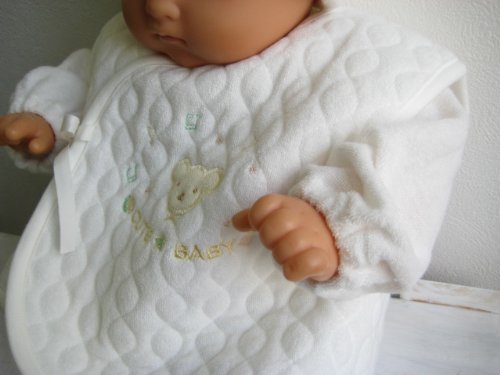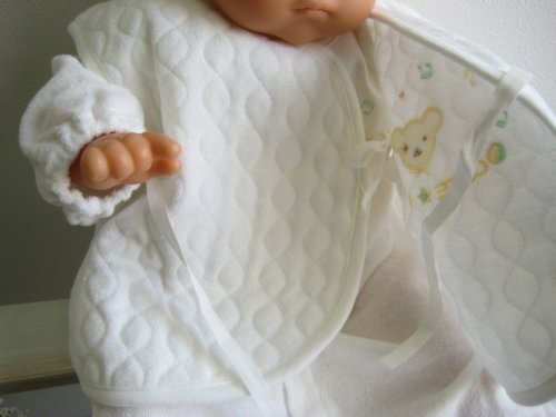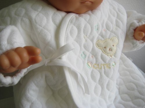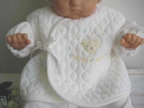 かわいいクマさんの刺繍入り、シンプルで上品なデザインですよ。肌触りがとっても優しい。内側と外側の2箇所を紐で結ぶ打ち合わせ式のベスト。新生児赤ちゃんの退院時やご出産お祝いプレゼントにもおすすめ。