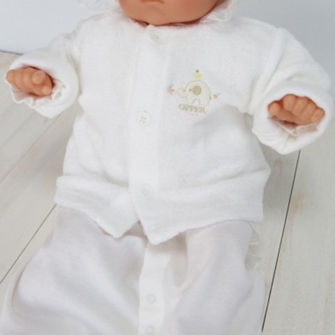 表示サイズ 50から70 【実寸】 着丈:27センチ 肩幅:22センチ 袖丈:20センチ 身幅:28センチ *ややゆったりとしたデザインです。着用期間は新生児から9か月を目安にお考えください。 生地縫製ともに高品質な日本製 甘撚(あまよ)りパイルは、糸の撚りを甘くして、肌触りを柔らかくしたパイル地です。 綿75% ポリエステル25% *パイル地の裏地(肌にあたる部分)は綿100%です。 *表地のみポリエステル混(25%)の素材。 生地・縫製ともに日本製! *肌触りにこだわった甘撚りパイルなので、素材の強度を補強するため、表地のパイル地部分にポリエステルが含まれております。 お出かけ用、ご出産祝いプレゼント用におすすめ!
