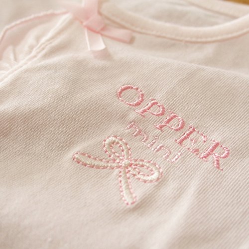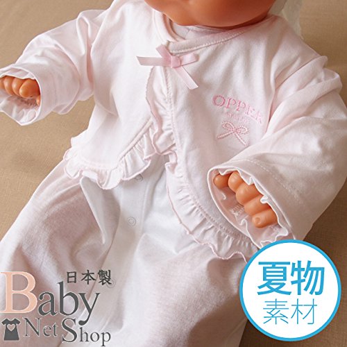 カラーは淡いピンクです。涼しげな夏物薄手の素材!後ろ側は抱っこしやすいシンプルなデザイン♪シルクのような光沢があり、上品な雰囲気です。実寸で総丈21センチ 肩幅20センチ 身幅27センチ 袖丈17センチ。着用期間は新生児から9ヶ月を目安にお考え下さい。