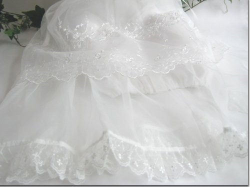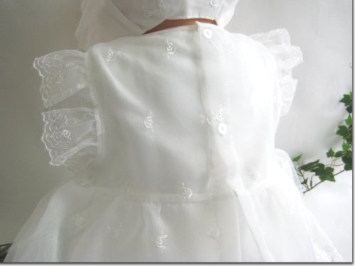 オーガンジーコートの丈は68センチで、2段になっているので、ふんわりと優しい雰囲気で記念写真などでは、とても映えるデザインになっています。襟元はすっきりとした丸襟!胸元には花のモチーフと光沢のあるサテンリボンが付いていて、とても華やかなデザイン!フリルもあり、可愛い赤ちゃんのアップ画像でも写真映えするデザインですよ!スカート部分はバラの刺繍柄が施されており、豪華で上品な雰囲気です!お宮参り・セレモニーなど大切な赤ちゃんの晴れ舞台に・・・・