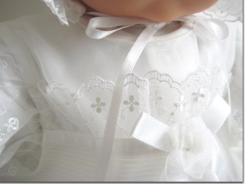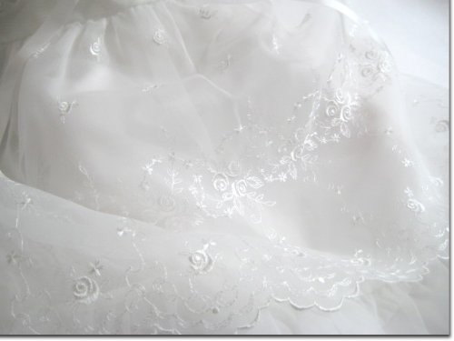 オーガンジーコートの丈は68センチで、2段になっているので、ふんわりと優しい雰囲気で記念写真などでは、とても映えるデザインになっています。襟元はすっきりとした丸襟!胸元には花のモチーフと光沢のあるサテンリボンが付いていて、とても華やかなデザイン!フリルもあり、可愛い赤ちゃんのアップ画像でも写真映えするデザインですよ!スカート部分はバラの刺繍柄が施されており、豪華で上品な雰囲気です!お宮参り・セレモニーなど大切な赤ちゃんの晴れ舞台に・・・・