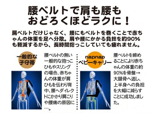 napnapベビーキャリーは、赤ちゃんの「重さ」を骨盤を通して「下半身」に逃がすことで、肩・腰への負担を最小限に抑えることができるのです。