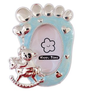 お馬に 乗った クマさんと 足型 かわいい ベビー フォトフレーム (ライトブルー)