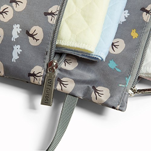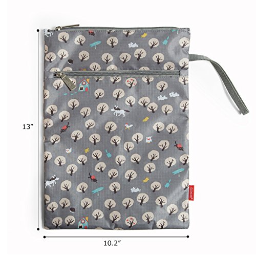 Durable Waterproof Polyester Material, easy clean;Dimensions: 10 x 14.5 inch (26 x 37CM), can holds up to 10 baby cloth diapers;Large zippered pocket for wet items or dirty diapers;Small front zippered pocket for other accessories;A handle for easy carrying or hanging on hooks