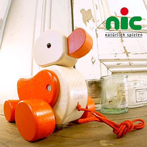 ドイツ・nic(ニック社)の厚い無垢のブナ材を使用した引き車/プルトイ・あひるシリーズ。 カタッカタッとキレのある音を出しながら前進するあひるのプルトイです。車輪と連動して首や羽が動きます。 厚みのある無垢のブナ材を使用することで、しっかりとした重みを持たせ、床で走らせた時の安定感を生んでいます。 引き車/プルトイとして、まだ自分で遊べない赤ちゃんの頃は、お母さんやお父さんが目の前で引いて動かしてあげて下さい。 赤ちゃんが、あひるに興味を持って、ついていこうと頑張り、ハイハイの促進になります。 歩けるようになったら、自ら車を引いて遊び、自然とあんよの練習になります。 ご出産祝いにもオススメです。 1889年創業のドイツの老舗おもちゃメーカーWalter(ヴァルター社/ワルター社)が、2006年に後継者不足のために操業を終えて、ニック社が引き継いで製造しています。長年妥協ないおもちゃ作りを続けてきたヴァルター社に敬意を表し、製品やパッケージにはヴァルター社のロゴが使用されています。 あひるのプルトイの赤い車輪の形や小さな目は、1995年にヴァルター社が製造したものをリメイクしたデザインになっています。