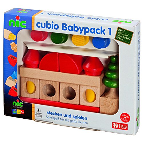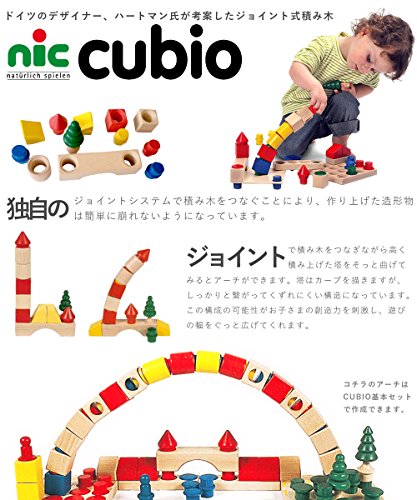 ドイツ・nic(ニック社)のジョイント式積み木「CUBIO クビオ/キュビオ」シリーズ。 基本的な積み木を多く含んだ20ピースセットです。 「CUBIO クビオ Jrパック」は、基本セットほどボリュームがありませんので、「汽車3両」や「フォーメル1」の追加パーツや、はじめてのCUBIOに挑戦するお子さまのお試しセットとしてオススメです。 ■CUBIO(クビオ/キュビオ)とは CUBIO(クビオ/キュビオ)は、ドイツのデザイナー、ハートマン氏が考案したジョイント式の積み木です。 独自のジョイントシステムで組み上げた造形物は、簡単に崩れないようになっています。 ジョイントを工夫すれば、アーチ状に組み上げたり、通常の積み木ではできない形も作ることができます。 ジョイントを積み木の穴に差し込む作業は、ペグさし遊びと同じ要領ですので、通常の積み木遊びより、指先の技巧性を高めてくれます。 簡単には崩れない仕組みは、「積み上げられる」や「組み立てられる」という達成感を得られ、ドイツではハンディキャップがある子どもにも広く活用されています。 積み木の基尺は3.6cmです。基本の積み木パーツの他に、人や木などパーツも入っていますので、積み木遊びからごっこ遊びへと遊びを広げることができます。 また、1歳から遊べる組み立てスロープ「CUBIO 玉の塔」とも互換性がありますので、組み合わせて遊ぶことができます。