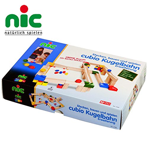 ドイツ・nic(ニック社)の1歳頃から遊べる組み立て木製スロープ「CUBIO クビオ/キュビオ 玉の塔」シリーズ。 ダイナミックなコースを作りたいときに活躍する補充セット45ピースセットです。 「CUBIO クビオ 玉の塔 基本セット」と「補充セット」を組み合わせると立体交差などの複雑なコースを作ることができます。 お友達と一緒に遊べる分量になります。 「CUBIO クビオ 玉の塔」は、大きなパーツで構成されていますので、安定感があり、1歳頃のお子さまの小さな手でもレールを並べることができます。 「CUBIO クビオ 玉の塔」の最大の特徴は、レールからはみ出すほど大きな直径45mmの玉です。 お子さまの目でも追える速さで、緩やかにダイナミックに転がります。 「CUBIO クビオ」シリーズのジョイント式積み木と互換性がありますので、組み合わせて遊ぶことができます。