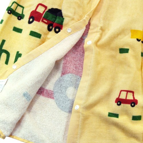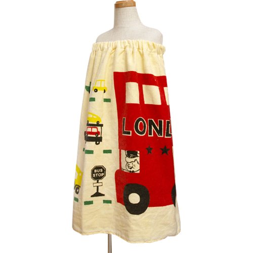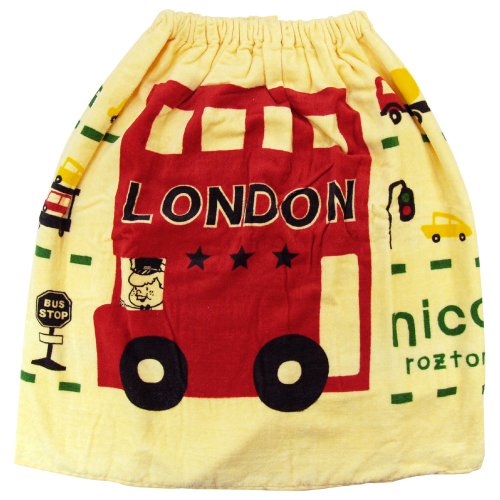 nico hratロンドンバスプリントお着替えラップタオルです。大きなロンドンバストカラフルな車のプリントが取ってもキュート!スナップボタンがついたラップ式で使いやすいよ♪ふかふかのやわらかコットンタオル地で吸水性も肌触りも抜群★◎!