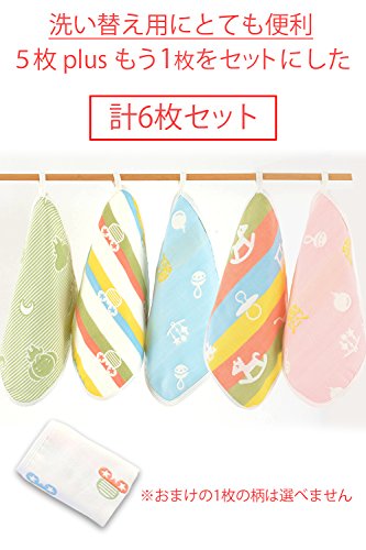 綿100%のやさしいガーゼハンカチです。ベビーや子供が喜ぶ可愛い柄とやさしい色合いが印象的です。5枚プラス1枚の計6枚組ですので洗い換えにも便利。縫製がしっかりしているので洗ってもへたりにくいです。やさしい肌触りで赤ちゃんのデリケートな肌にも安心して使えます。吊り下げループがついておりフックなどにかけられるので保育園、幼稚園でも重宝します。汗拭き、沐浴時のタオルとして、ミルクの吐き戻し、食事時など口拭きとして。サイズは25cm×25cmで使いやすい正方形タイプ。