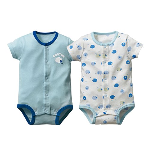 やわらかく伸びの良い綿100%のフライス素材を使用したボディスーツを男の子と女の子用の無地&柄でご用意。半袖だから季節を問わず使え、前開きなので、寝たままでもお着替えできてラクチンです。