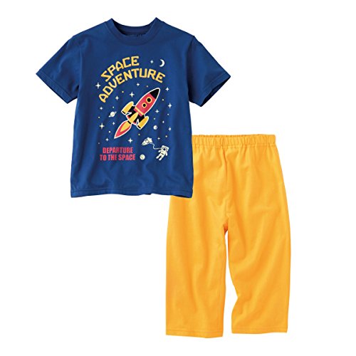 電気を消すと・・・柄が光る!おやすみタイムが待ち遠しくなる蓄光プリントTシャツに、ハーフパンツをセットした楽しいパジャマ。綿100%カットソー素材で肌触りのよさも◎。