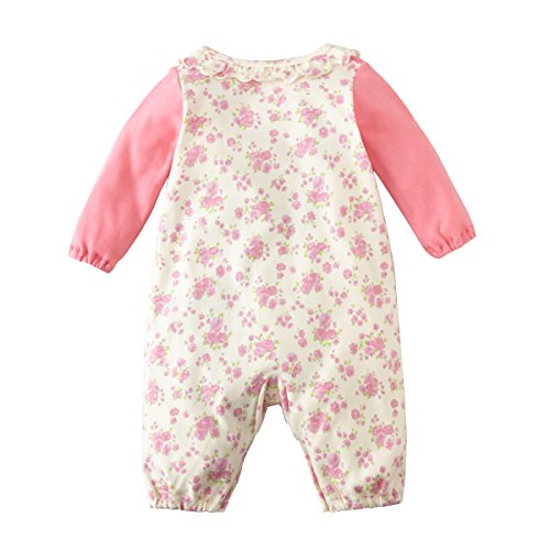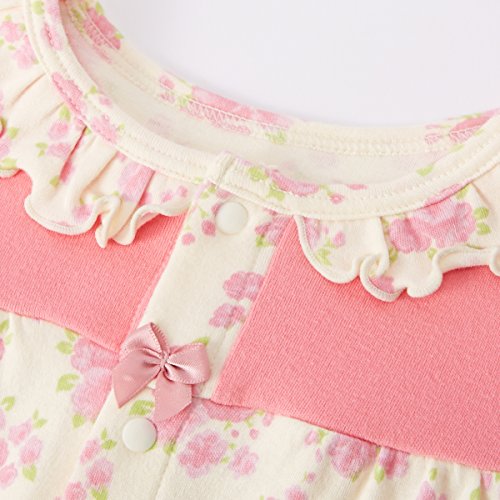 前全開開きのカバーオールはピンクの小花柄にフリルをあしらったラブリーなデザインで、可愛さも着替えやすさも両立。身生地綿100%のスムース素材で肌触りも抜群です。