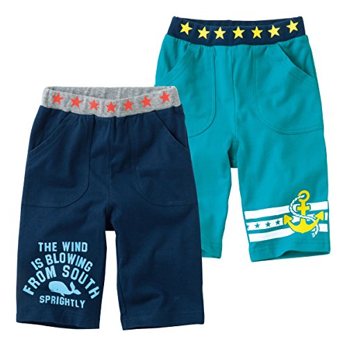 ソフトな肌触りの綿100%カットソー素材に、星柄ウエストがアクセント。ウエスト内側にはゴム調節口も付いています。夏らしいクジラ柄とイカリ柄の2枚組でお届け。