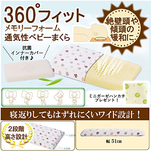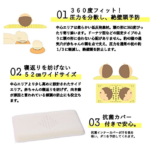1 メモリーフォームベビー枕絶壁頭や傾頭の防止に!!171個の通気穴で蒸れにくい!抗菌インナーカバー付き♪ 2 360度フィット!赤ちゃんの頭にかかる圧力は通常の枕の1/3。圧力を分散し、絶壁頭を予防します。 3 寝返りしてもはずれいくい!幅51センチのワイド設計。高さ2段階設計で0歳から3歳まで、長~く使えます。 4 低反発素材&合理的な構造設計が特徴。寝心地がよく、赤ちゃんが熟睡するようになった!という嬉しいお声も! 5 外カバーは外して洗濯できるので衛生的です。(インナーカバーは外せません)