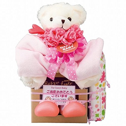 仕様 パンパース紙おむつSサイズ8枚・30×76cmフェイスタオル1枚・綿100%・11.5cm(対象年齢6~18ヵ月)トレーニングシューズ1足・アッパー部:コットン、ポリウレタン・底部:サーモプラスチックラバー・高さ約20cmくまのぬいぐるみ1体・おしりふき1個付・おむつ[日本製]・トレーニングシューズ[韓国製]・その他[中国製]