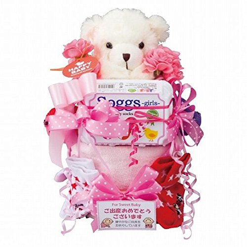 仕様 パンパース紙おむつSサイズ13枚・8~11cmベビー用くつ下6足・高さ約20cmくまのぬいぐるみ1体・30×76cmフェイスタオル1枚・綿100%・おむつ[日本製]・その他[中国製]