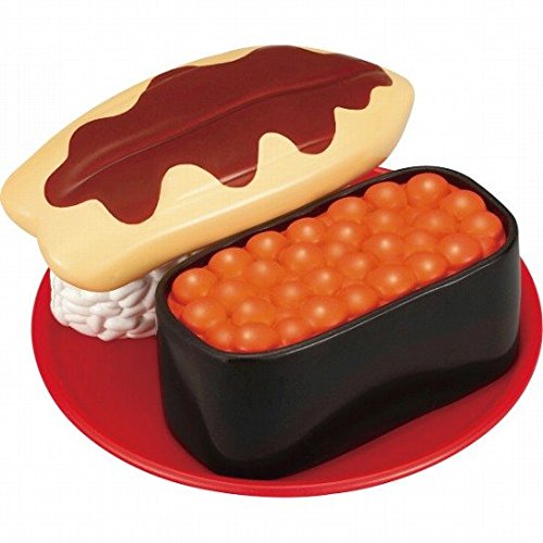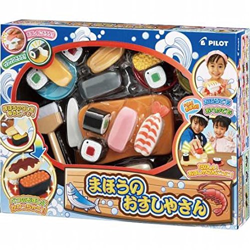 素材 ●マグロ・イカバジルソース・サーモン・金の魚・タレ付き穴子・車エビ・鉄火巻き・かっぱ巻き=ABS樹脂・ナイロン、シャリ=ポリプロピレン・ナイロン、まほうの壺・ゲタ・包丁・皿=ポリプロピレン、花太巻き・イクラ軍艦=ABS樹脂、ハケ=ABS樹脂・ポリエステル、収納袋=ポリエステル、プレイシート=ポリエチレン