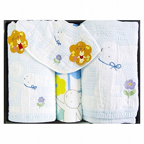- Size:ポンチョ(約320x270mm)・スタイ(約270x250mm)・フェイスタオル(約340x800mm)・おくるみ(約800x800mm)x各1