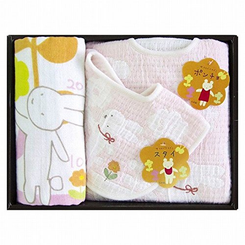- Size:ポンチョ(約320x270mm)・スタイ(約270x250mm)・フェイスタオル(約340x800mm)x各1