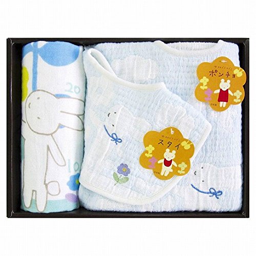 - Size:ポンチョ(約320x270mm)・スタイ(約270x250mm)・フェイスタオル(約340x800mm)x各1
